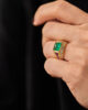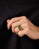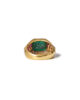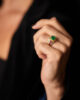 A sugarloaf-cut emerald gives the gemstone a sculptural presence. Its high, domed cabochon emphasizes depth of color over brilliance, allowing the emerald’s saturated green to read as a continuous, velvety field of light. The cut softens inclusions and enhances the stone’s natural character, creating a sense of quiet power and architectural volume.