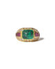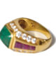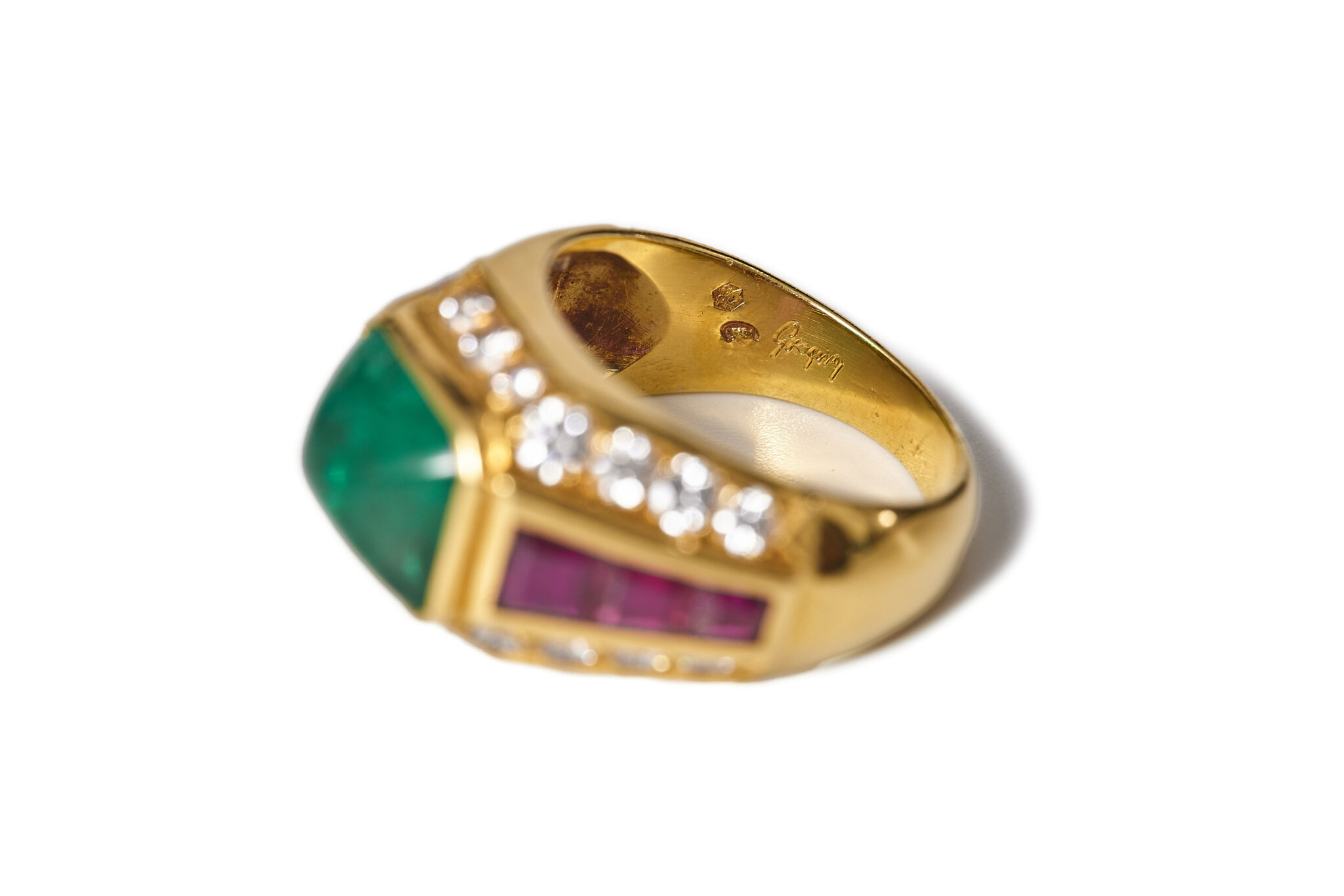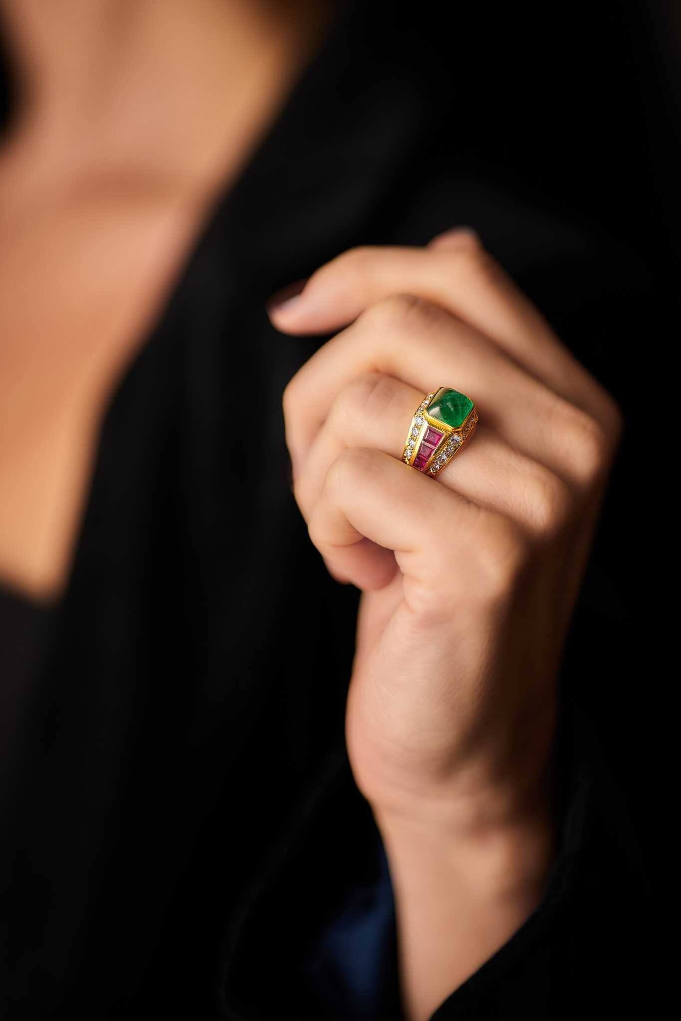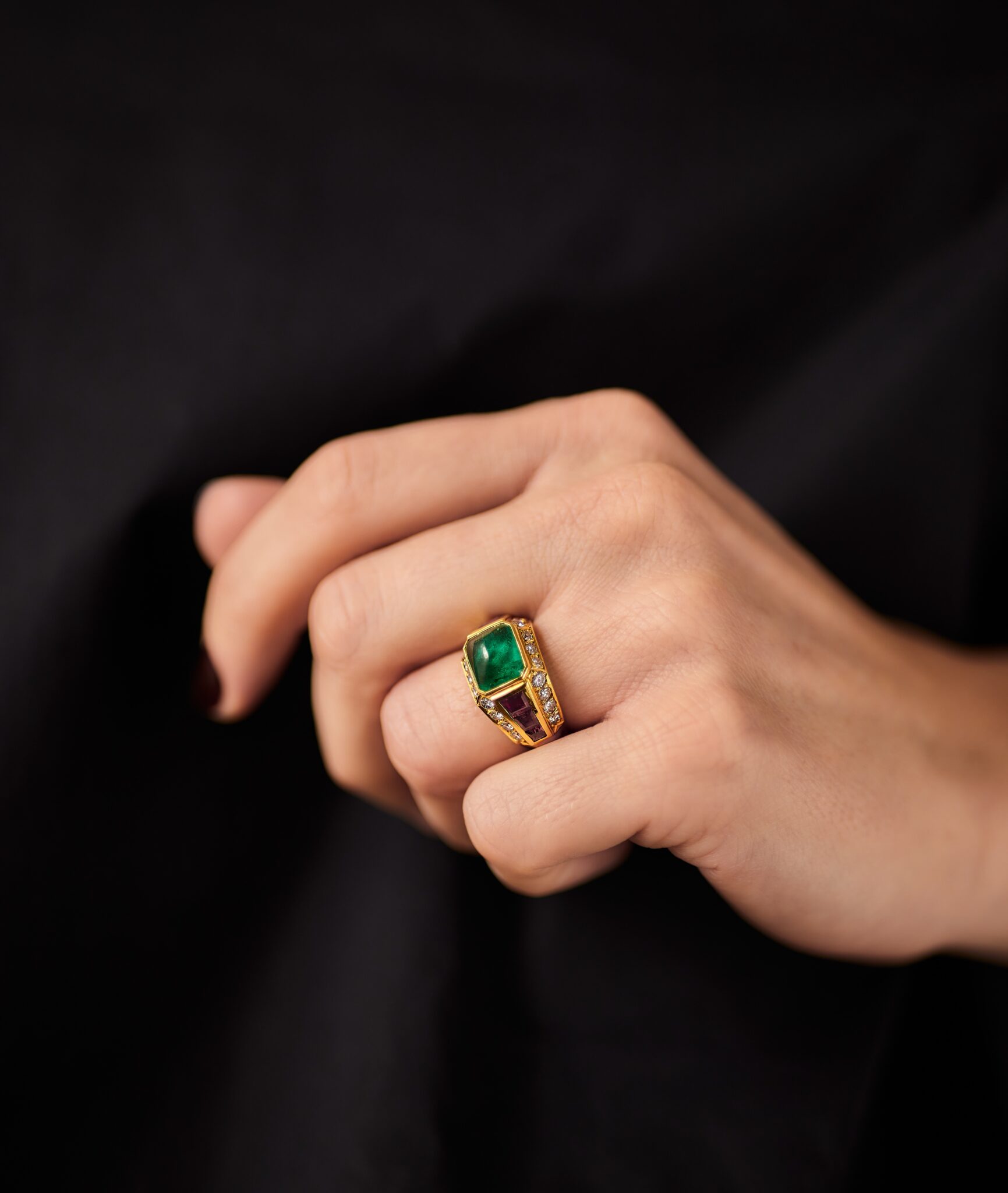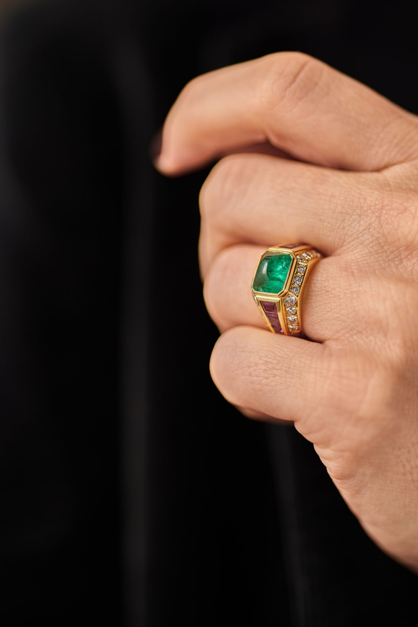 The ring is strong and geometrical. Clear gold lines, complementing gemstone shapes. The sugarloaf emerald glowing on top. Calibrated tapered rubies, all framed by brilliant cut diamonds.