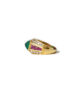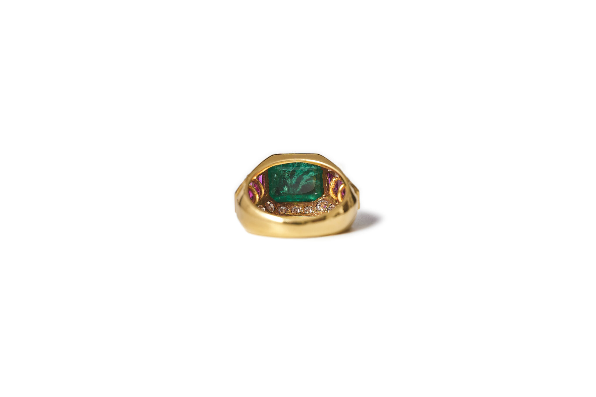 Set in 18kt gold, the warmth of the metal enriches the emerald’s green, giving it added depth and radiance. Rubies introduce a vivid chromatic counterpoint. Red against green heightens intensity and drama, while diamonds frame the composition with brilliance, providing light and definition. The contrast between the smooth dome of the sugarloaf and the faceted sparkle of the diamonds creates dimensional tension.