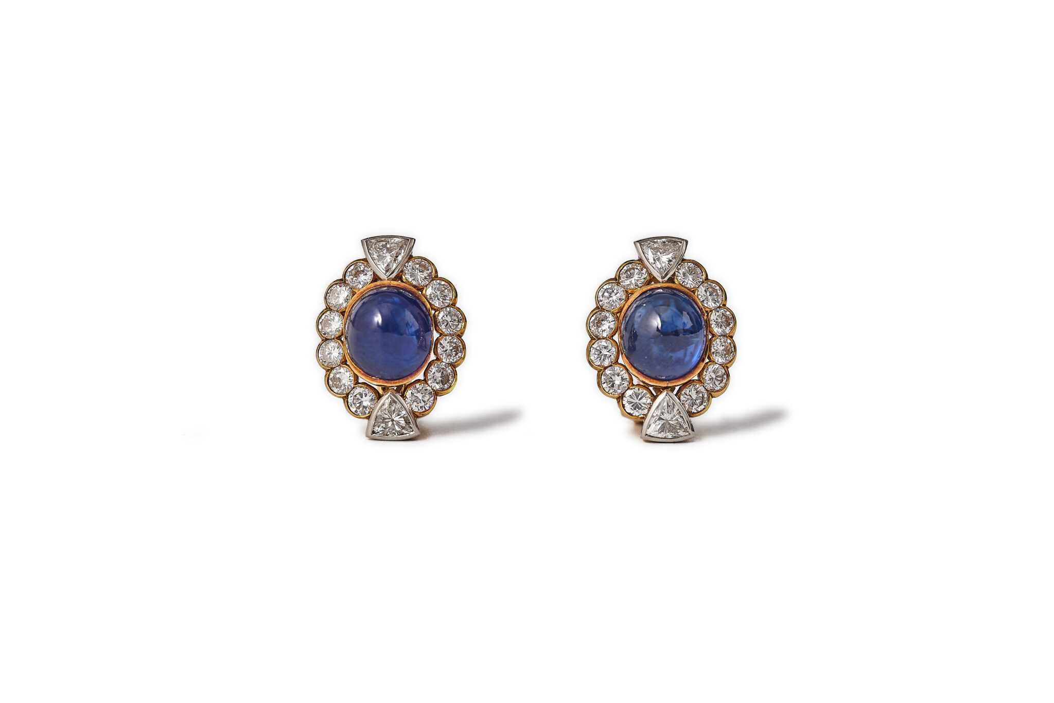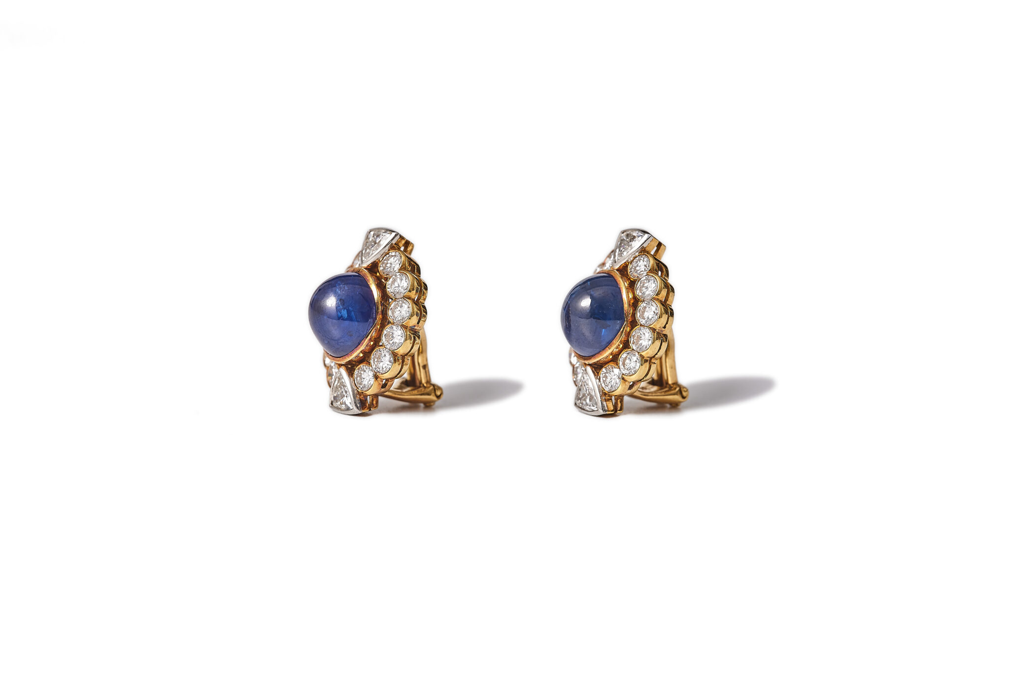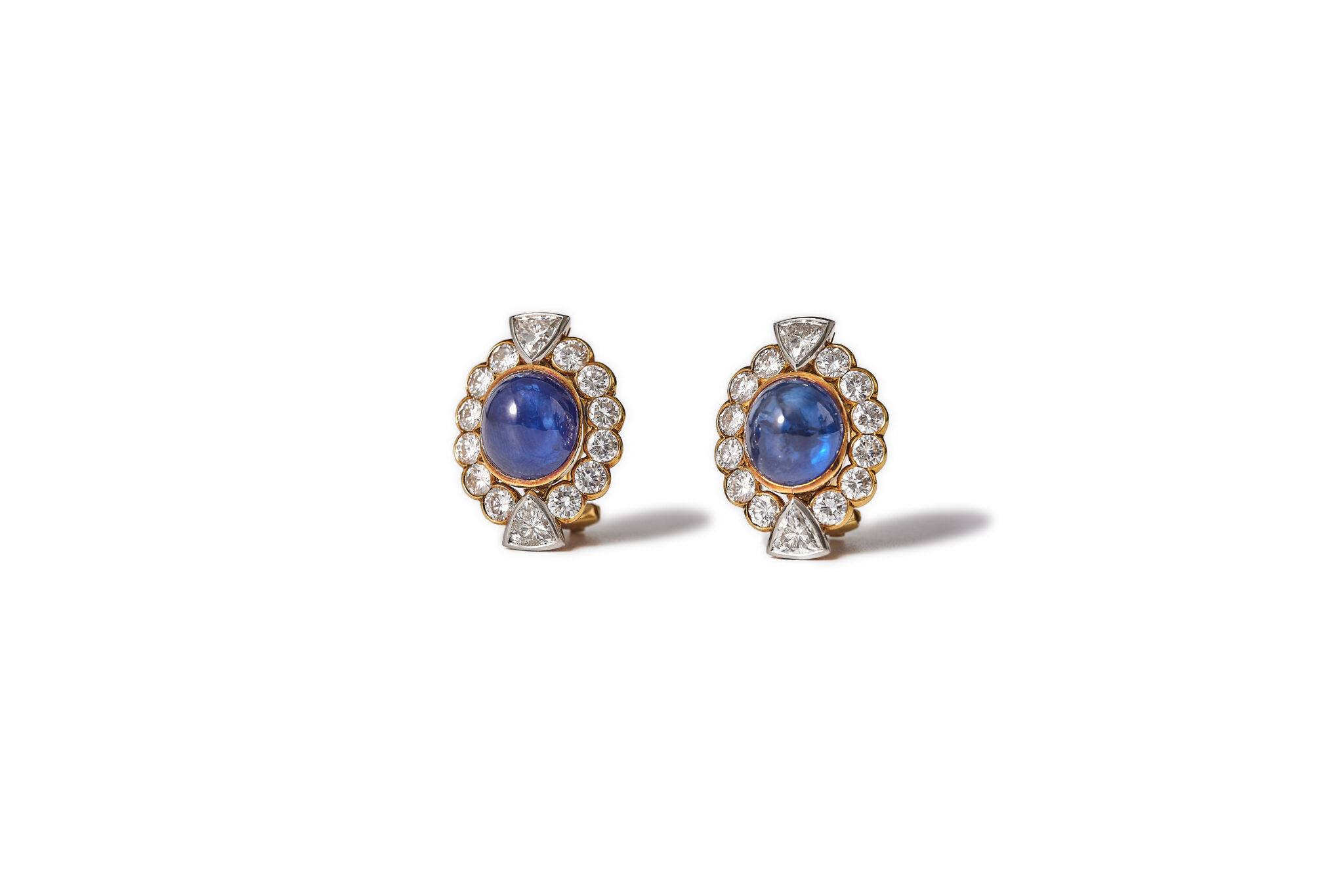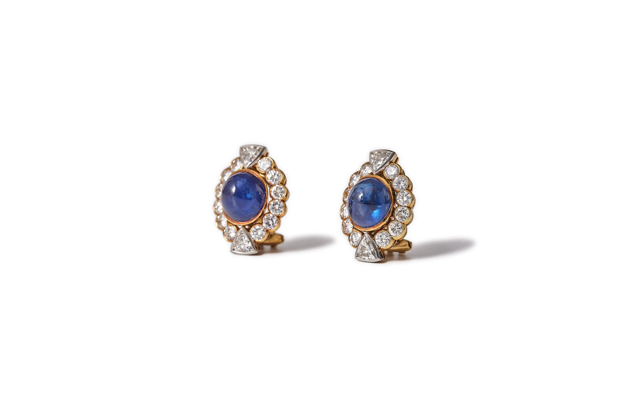 Brilliant and trilliant cut diamonds that surround a cabochon cut sapphire. The diamonds are high quality D-H / Vs-SI2, total weight approx. 3,5ct and the sapphires are estimated to be approx. 8ct total. Made in 18kt yellow och and white gold. The clip holds firm. The earrings are in excellent condition.