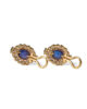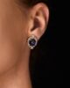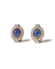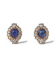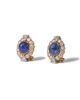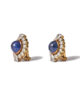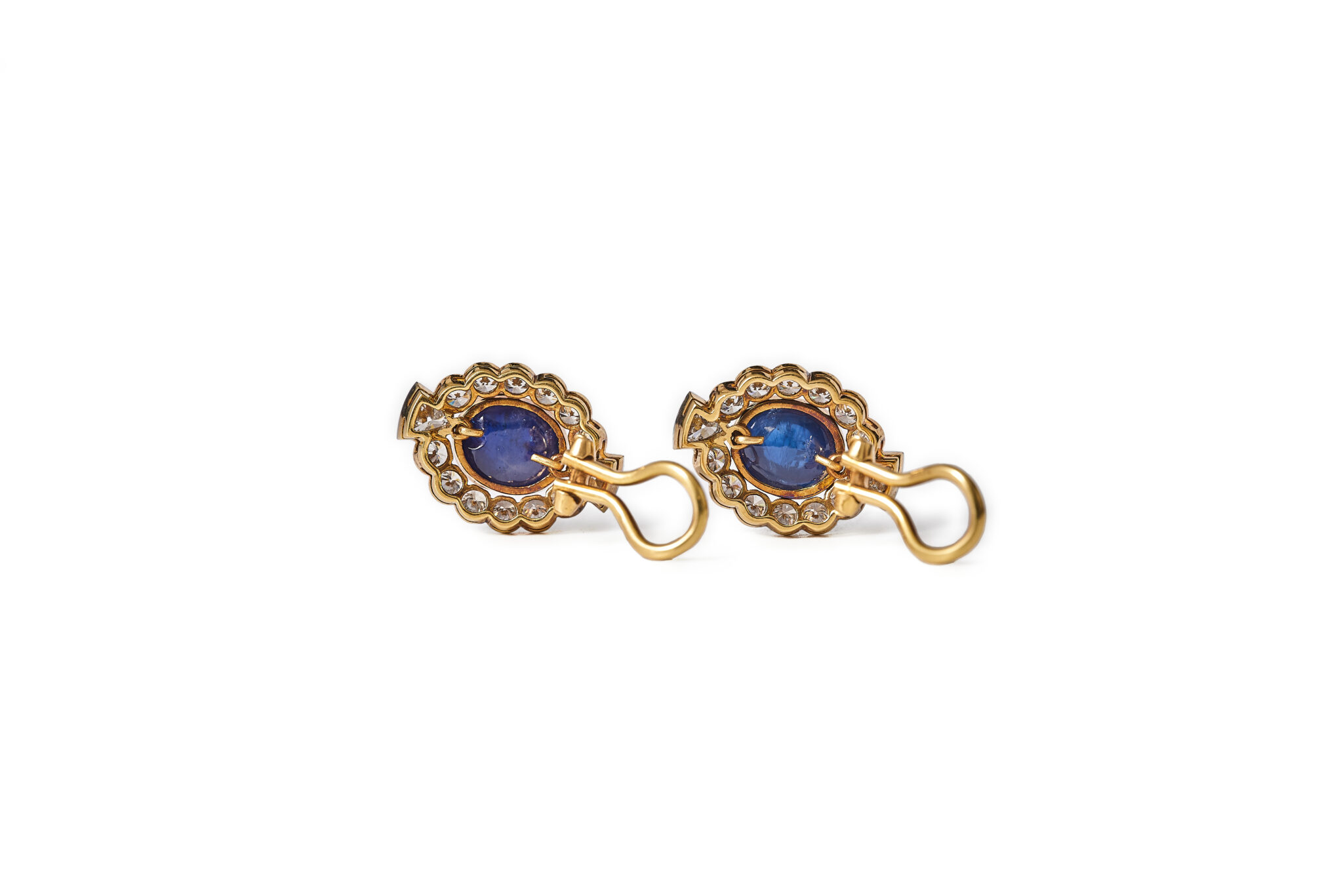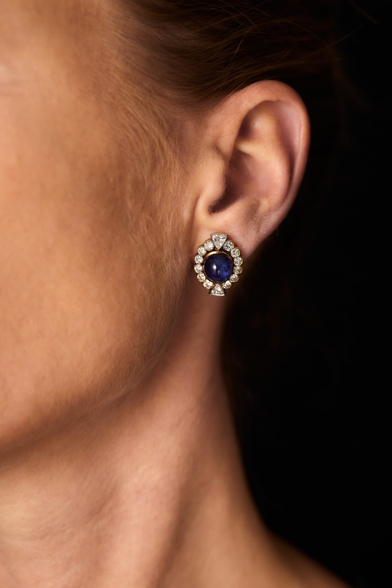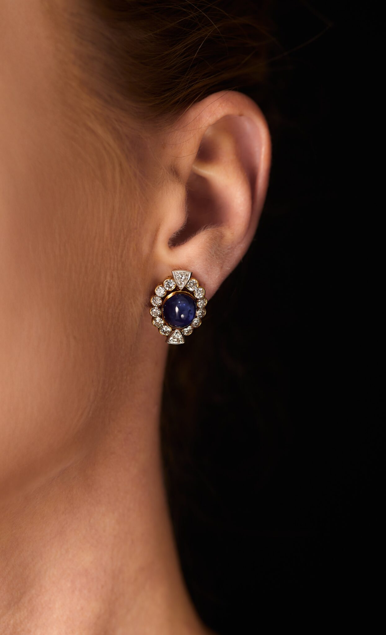 Brilliant and trilliant cut diamonds that surround a cabochon cut sapphire. The diamonds are high quality D-H / Vs-SI2, total weight approx. 3,5ct and the sapphires are estimated to be approx. 8ct total. Made in 18kt yellow och and white gold. The clip holds firm. The earrings are in excellent condition.