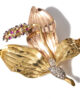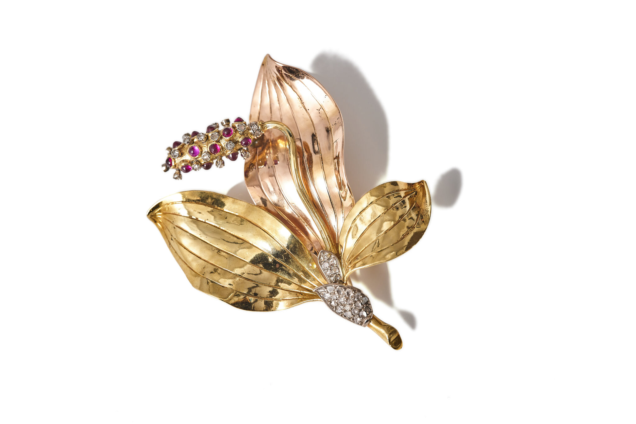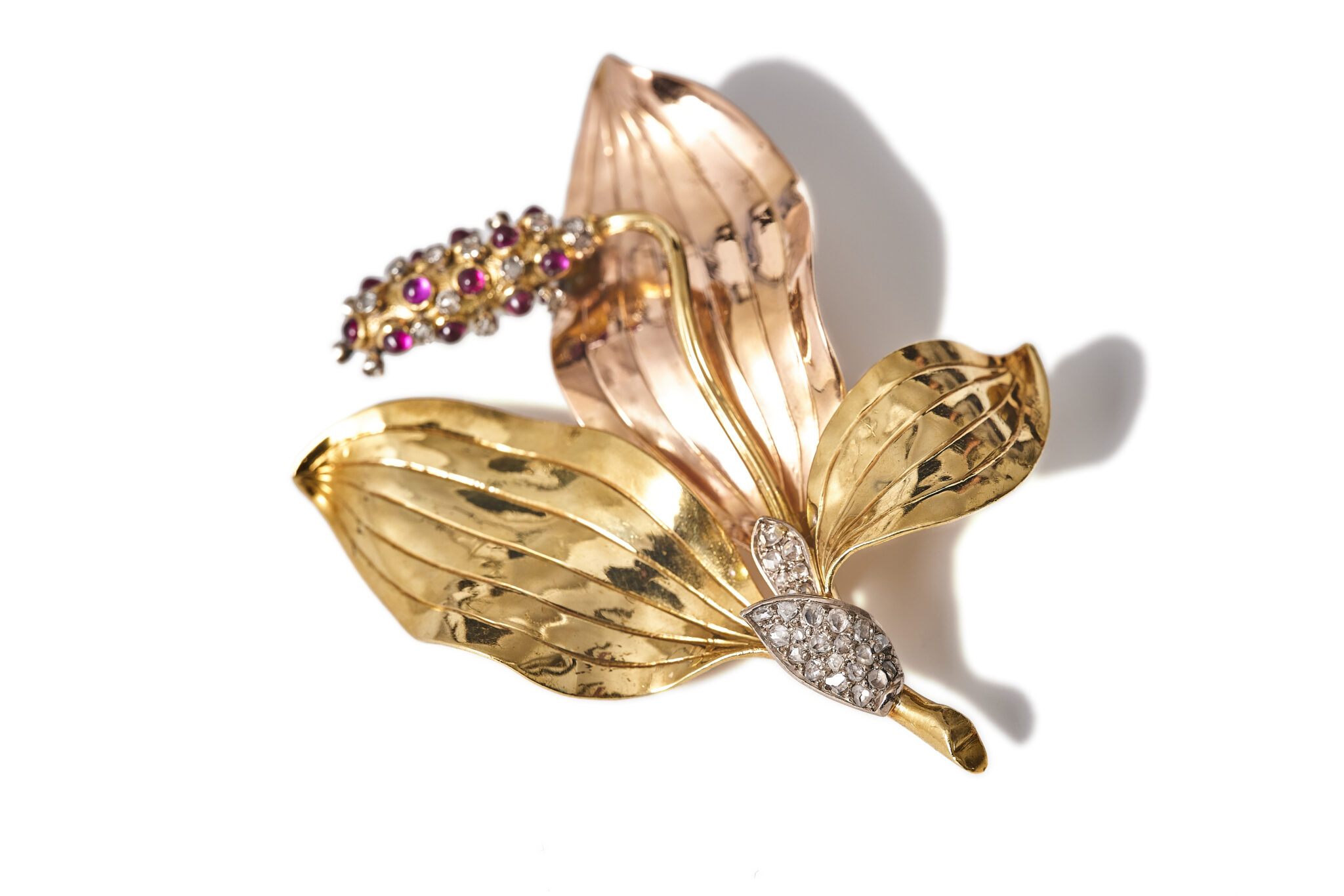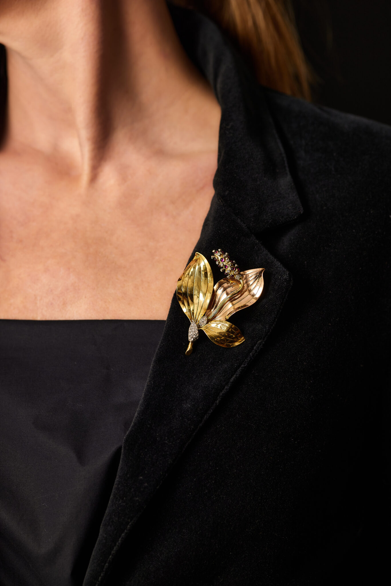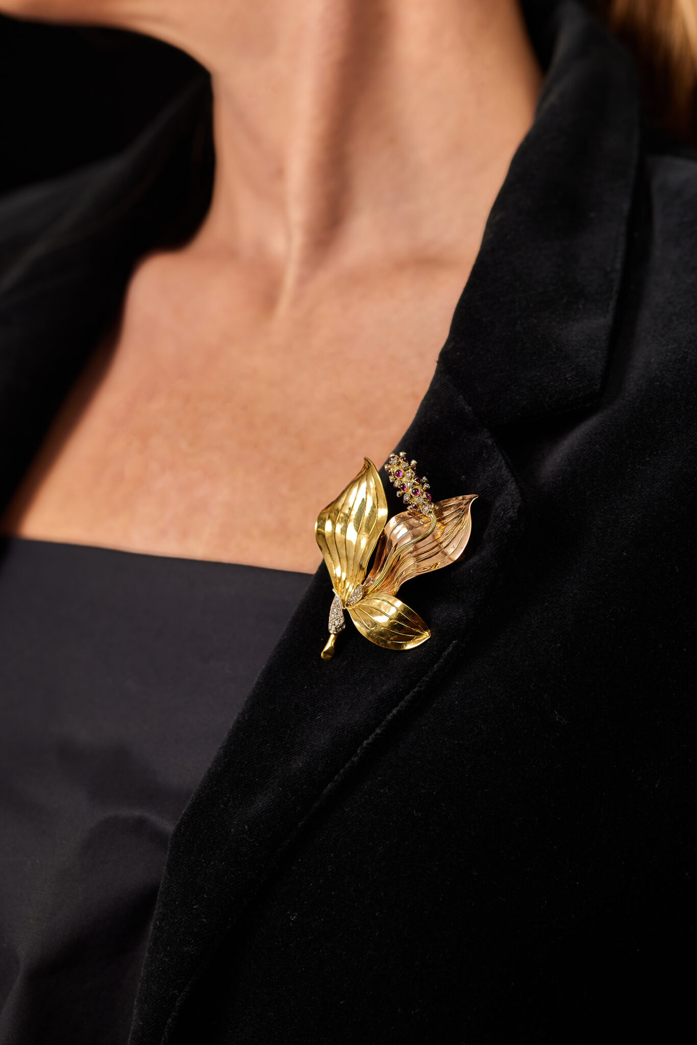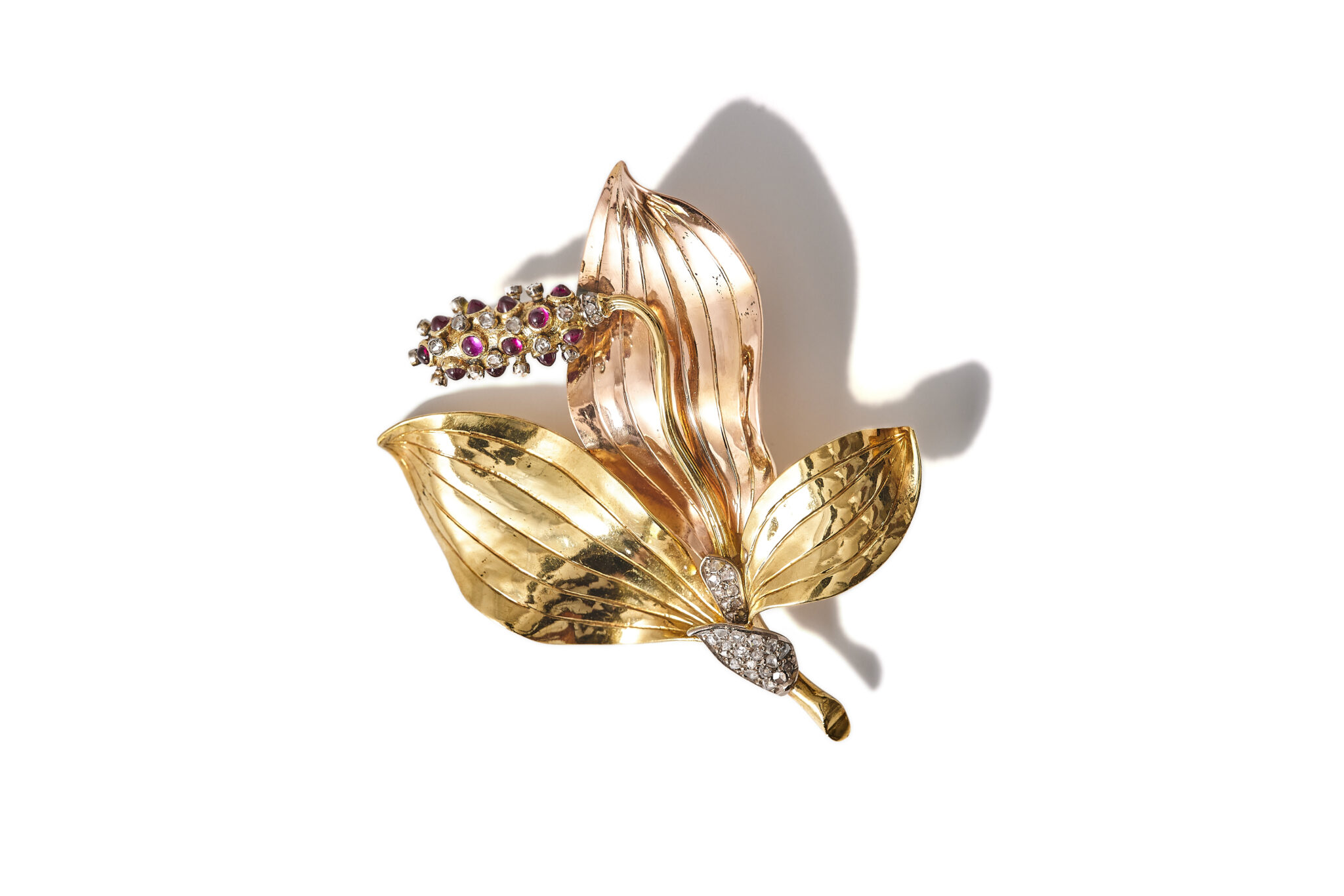 Floral motifs were especially resonant in the 1940s, symbolizing renewal and resilience during a period marked by uncertainty. Here, the naturalistic form is interpreted with painterly goldwork and tactile gemstone choices, transforming the brooch into a miniature work of art.