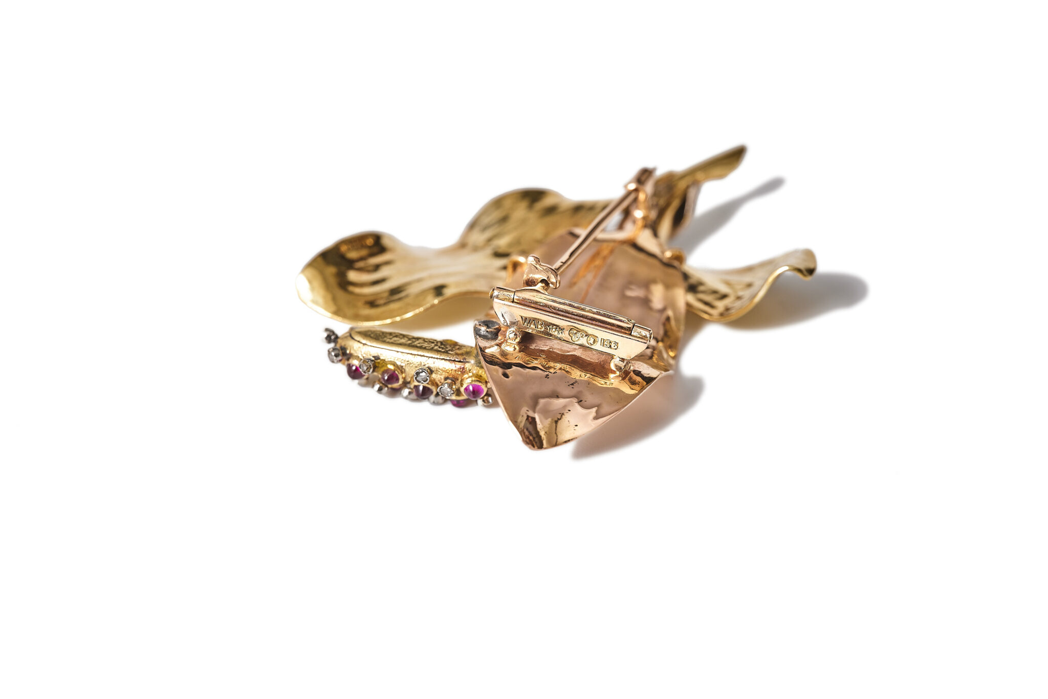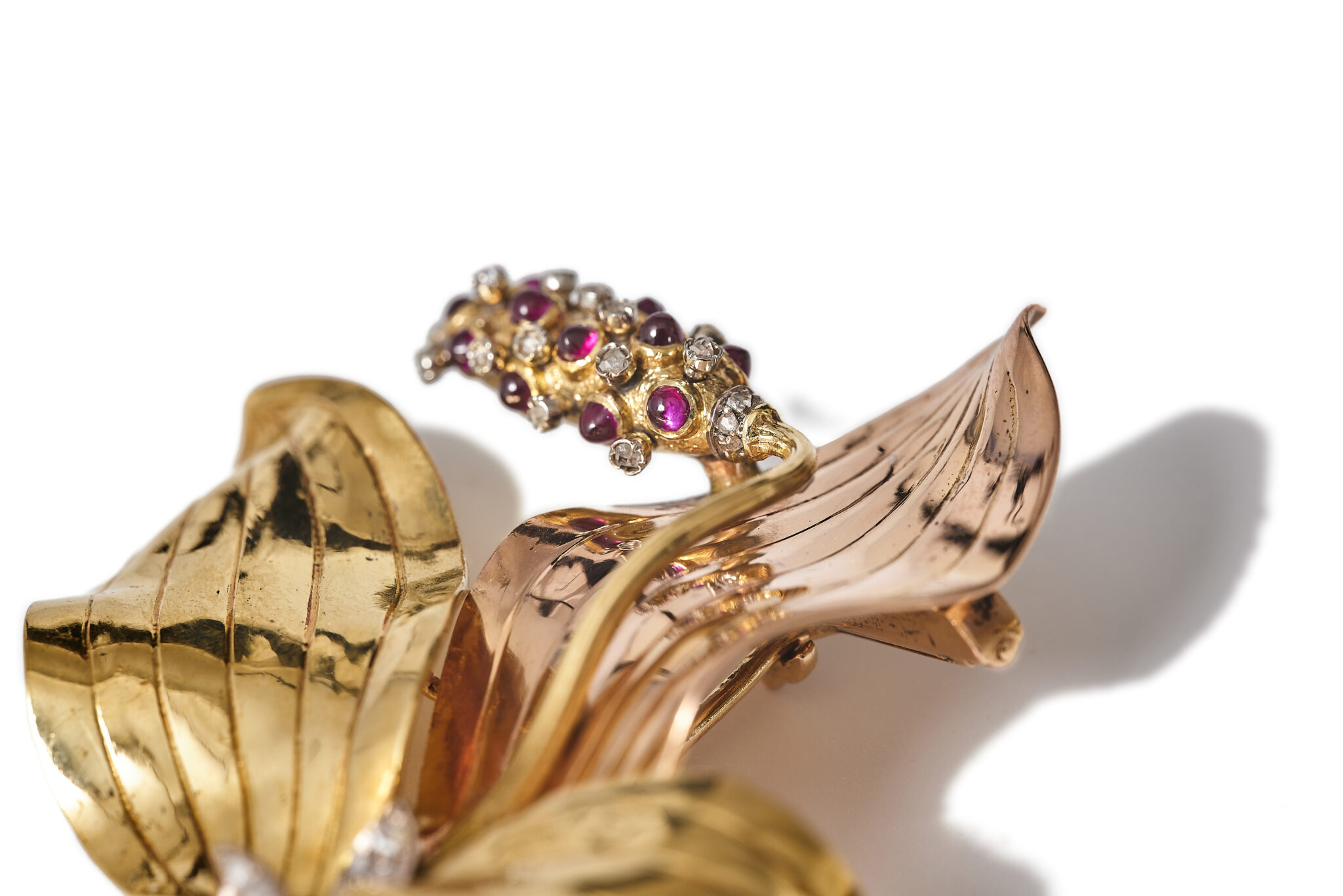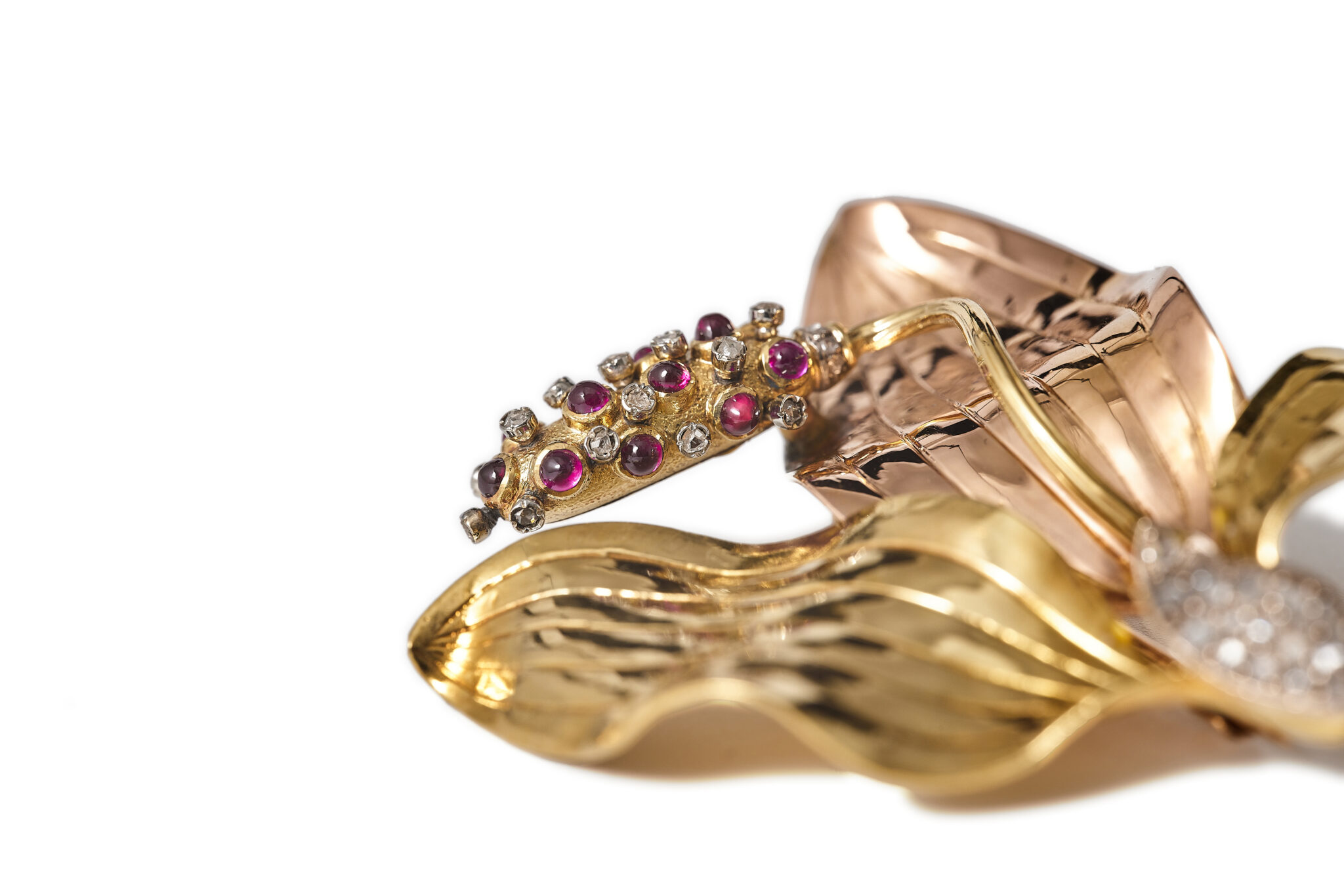 Crafted in 18K yellow and rose gold, this striking floral brooch by W.A. Bolin exemplifies the elegance and optimism of 1940s jewelry design. Measuring approximately 60 × 50 mm and weighing 22.6 grams, the sculptural flower is richly articulated, its pistils delicately set with cabochon-cut rubies and rose-cut diamonds that lend depth, warmth, and a softly glowing brilliance. Stamped WAB, Stockholm, the brooch reflects meticulous handcraft and refined material harmony.