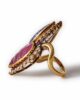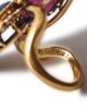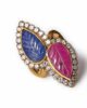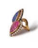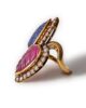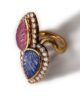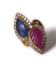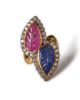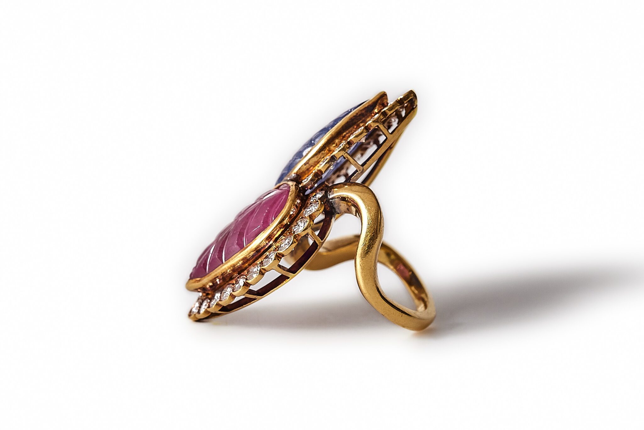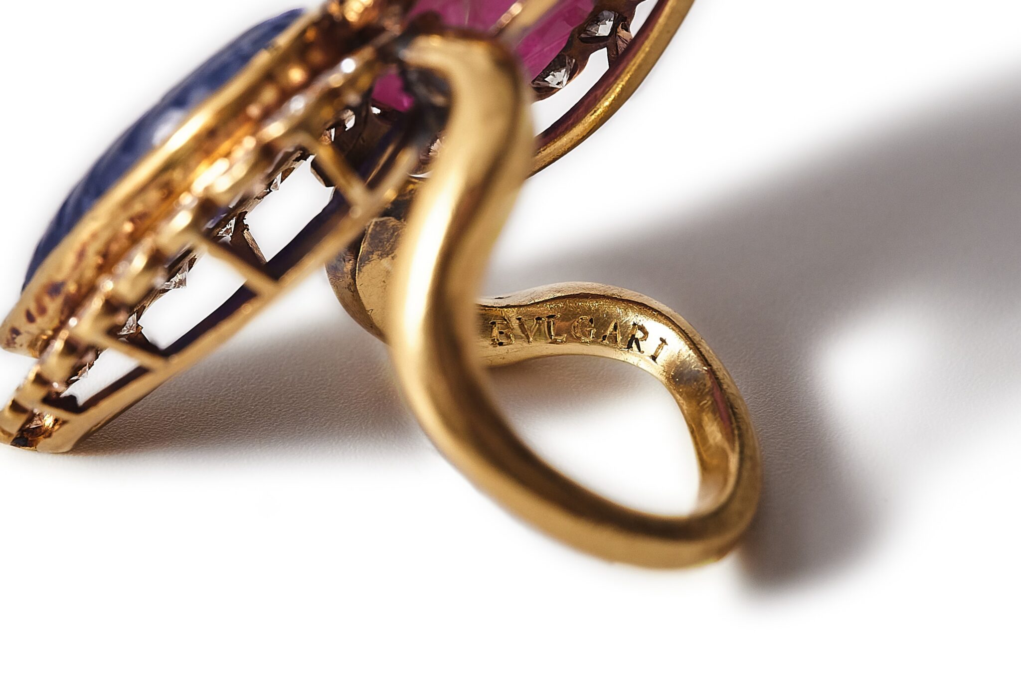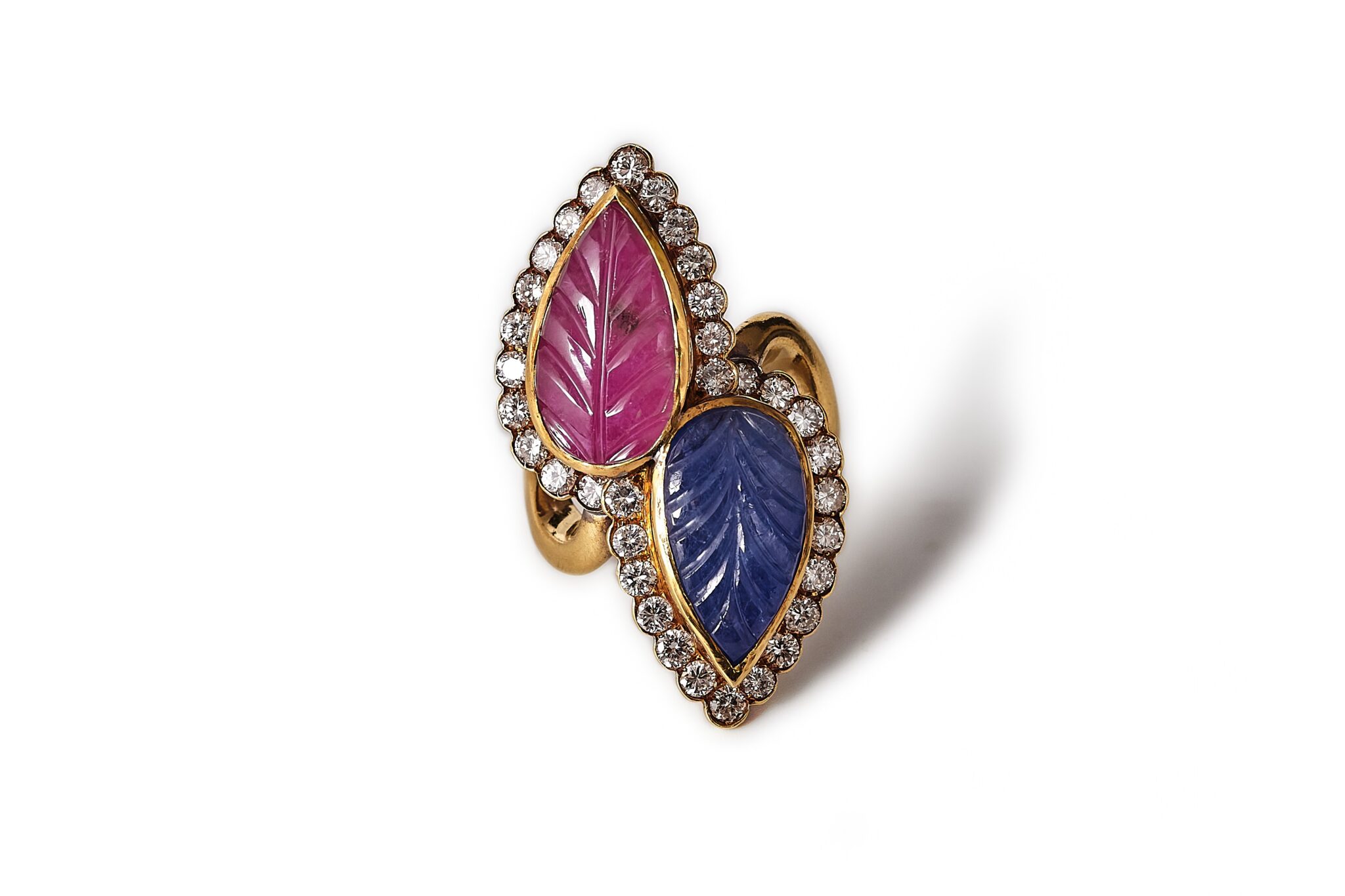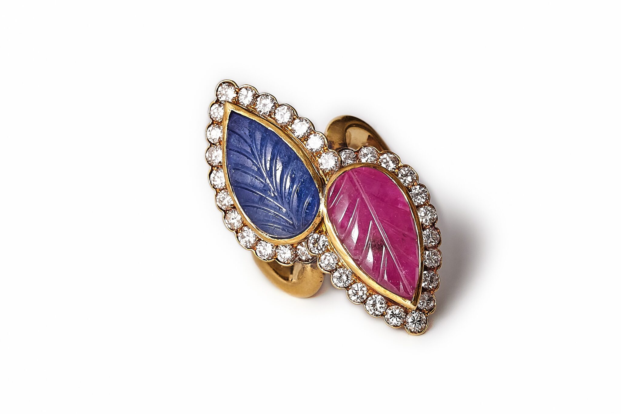 A big and colorful statement ring from joyful 70ies in Rome. The ring has a crossover design, set with two large carved gems leaves. One pear shaped carved ruby and one carved sapphire, with foliate detailing. Framed within scalloped borders of brilliant-cut diamonds, mounted in 18K gold, signed Bvlgari,
