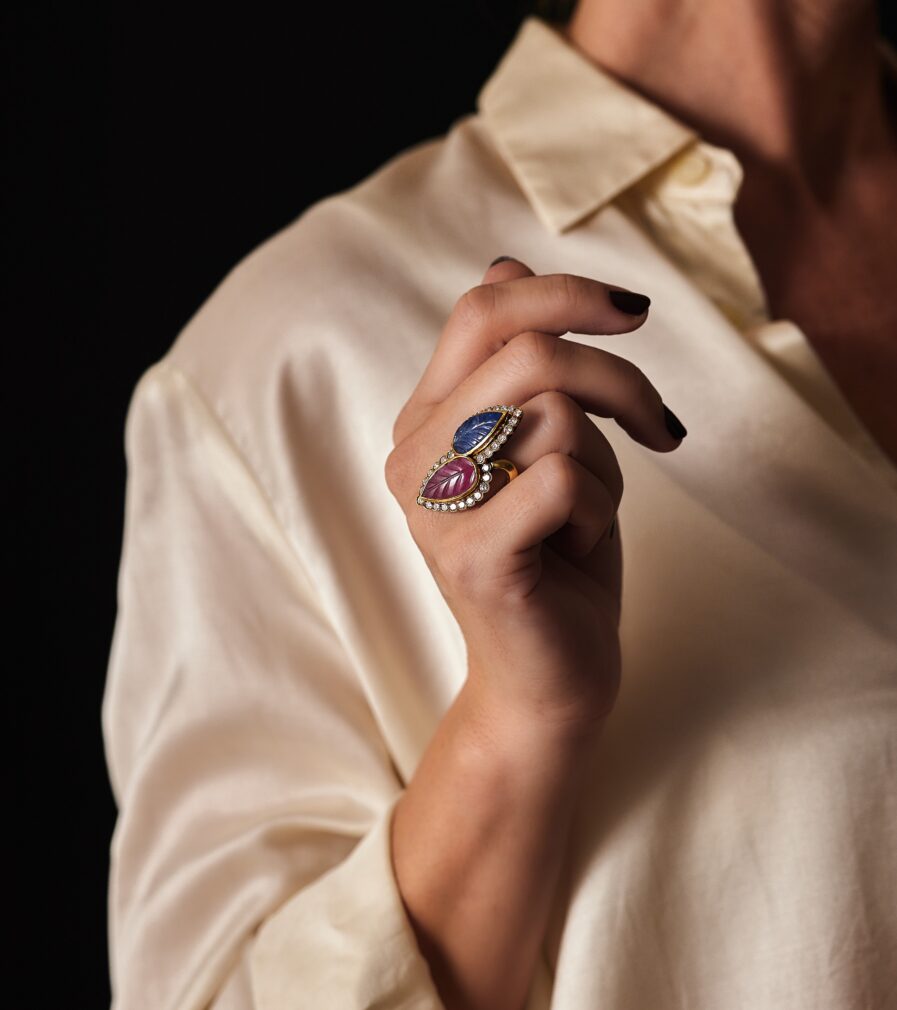 The gemstone leaves, intricately carved and engraved with lifelike veins, showcase Bulgari’s mastery of color and form. Their bold hues and large scale reflect a contemporary reinterpretation of motifs rooted in the 16th century Mughal jewelry tradition, where artisans created lavish floral and foliate designs in precious stones. In Mughal jewels, carved gemstones—often in high-relief or intaglio—were prized for their sculptural qualities, bringing a tactile richness to intricate patterns.
