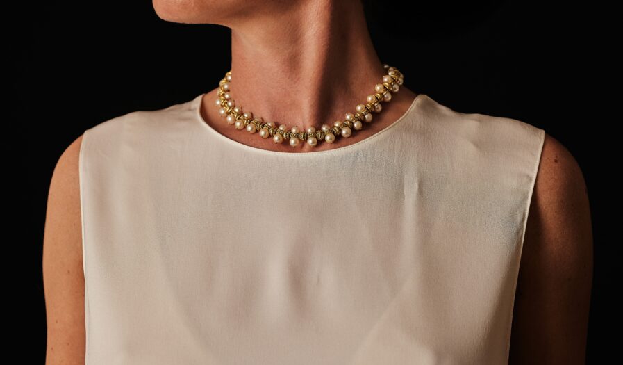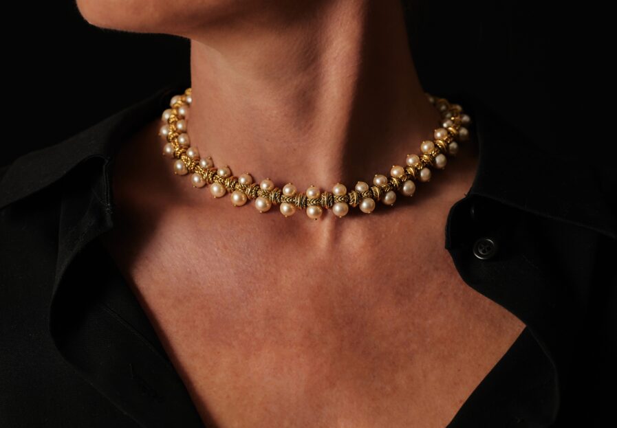 Necklace In 18k yellow gold, stylized as a rope enhanced with cultured pearls.