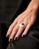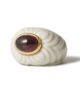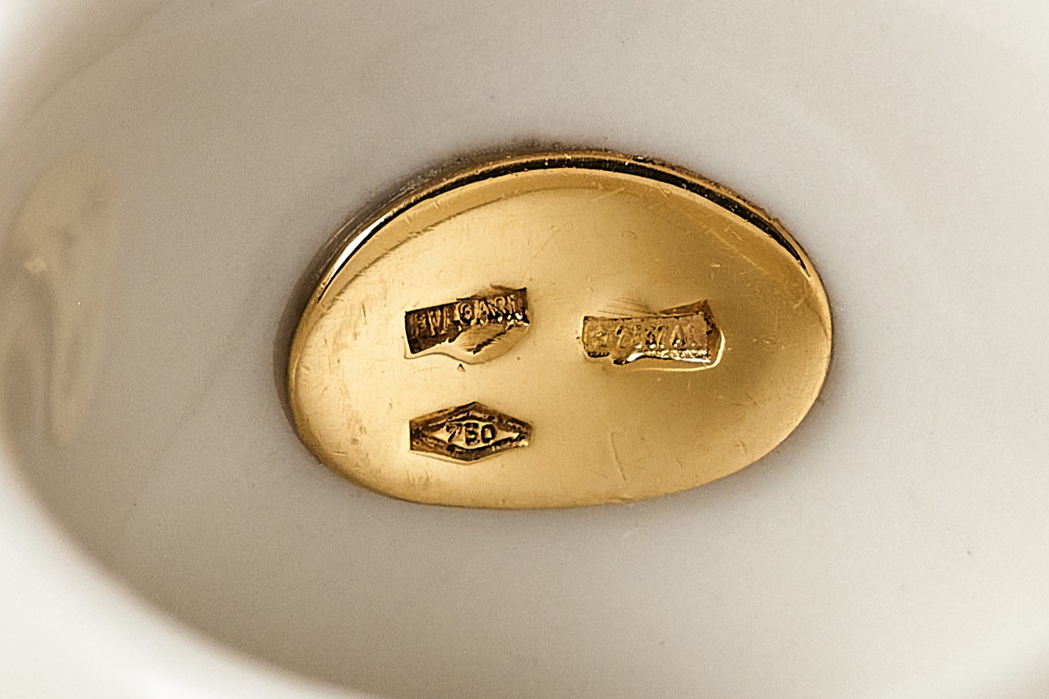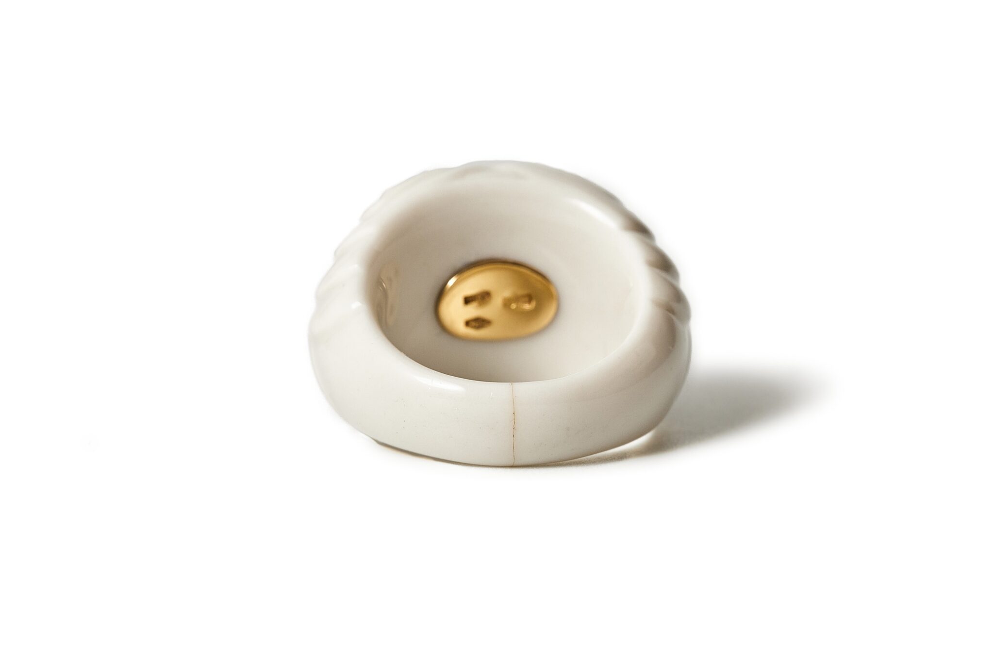 Designed as a series of part textured crisp porcelain spheres depicting a flower. Rather than relying on gemstones for impact, Bulgari allowed material, volume, and symbolism to take center stage. Porcelain overall in excellent condition with the exception for a a very thin, superficial fissure in shank base. We have had a porcelain expert restaurateur look at it and his professional opinion is that it will not affect the integrity of the ring. It is possible to mask but we have left it visible to be transparent.  No evidence of wear to the metal.