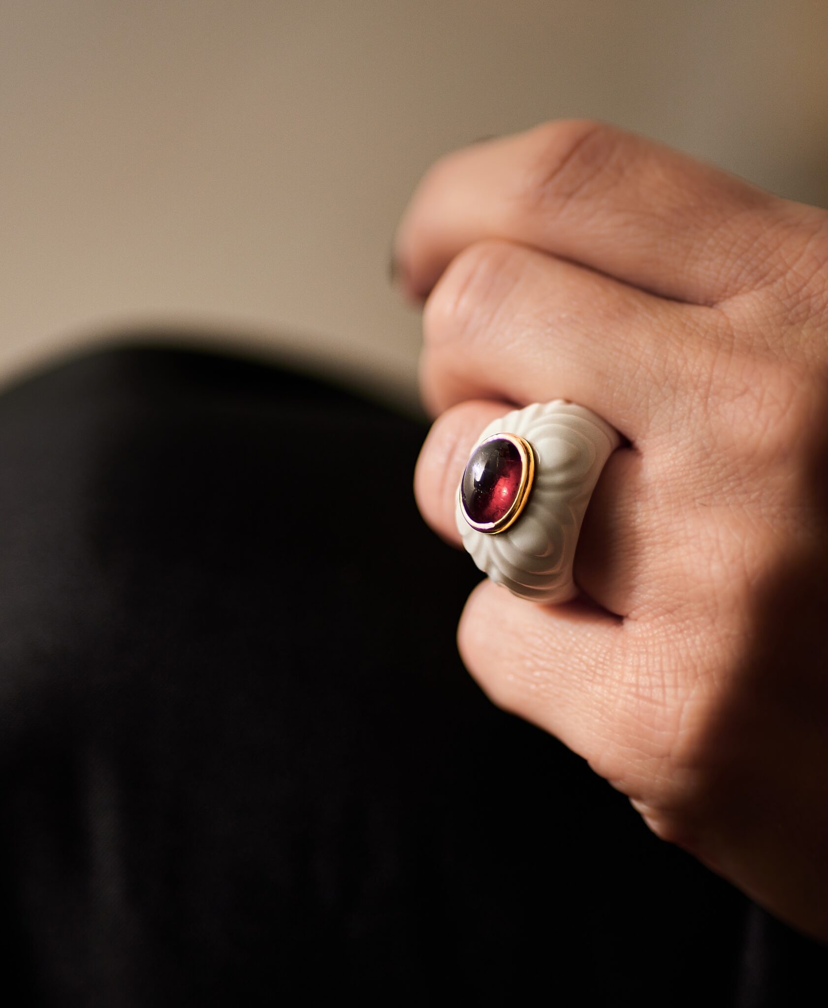 Hello 90s! A beautiful ring in 18kt yellow gold and white Bombé-shaped, porcelain, set with one natural vibrant deep 2.50 ct cabochon cut rubelite. Signed Bulgari, from the “Chandra” collection, Made in Italy, circa 1990.