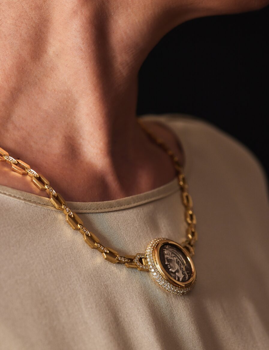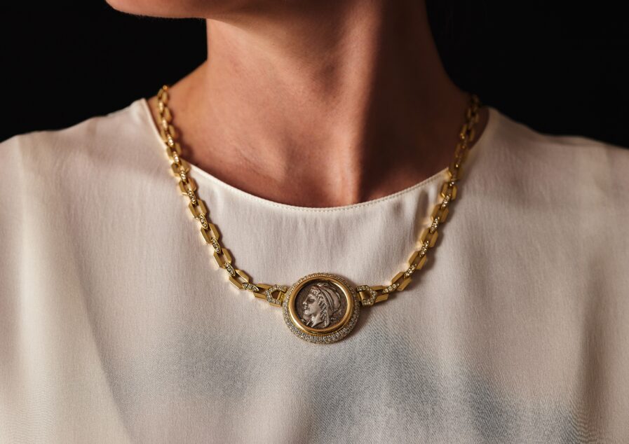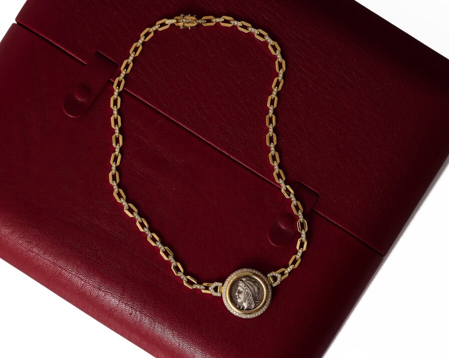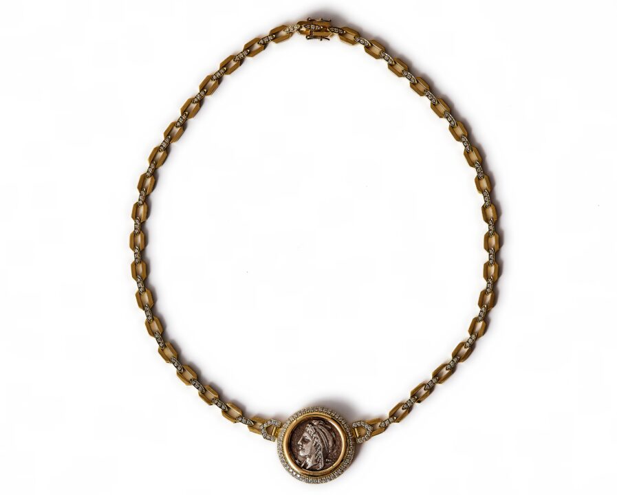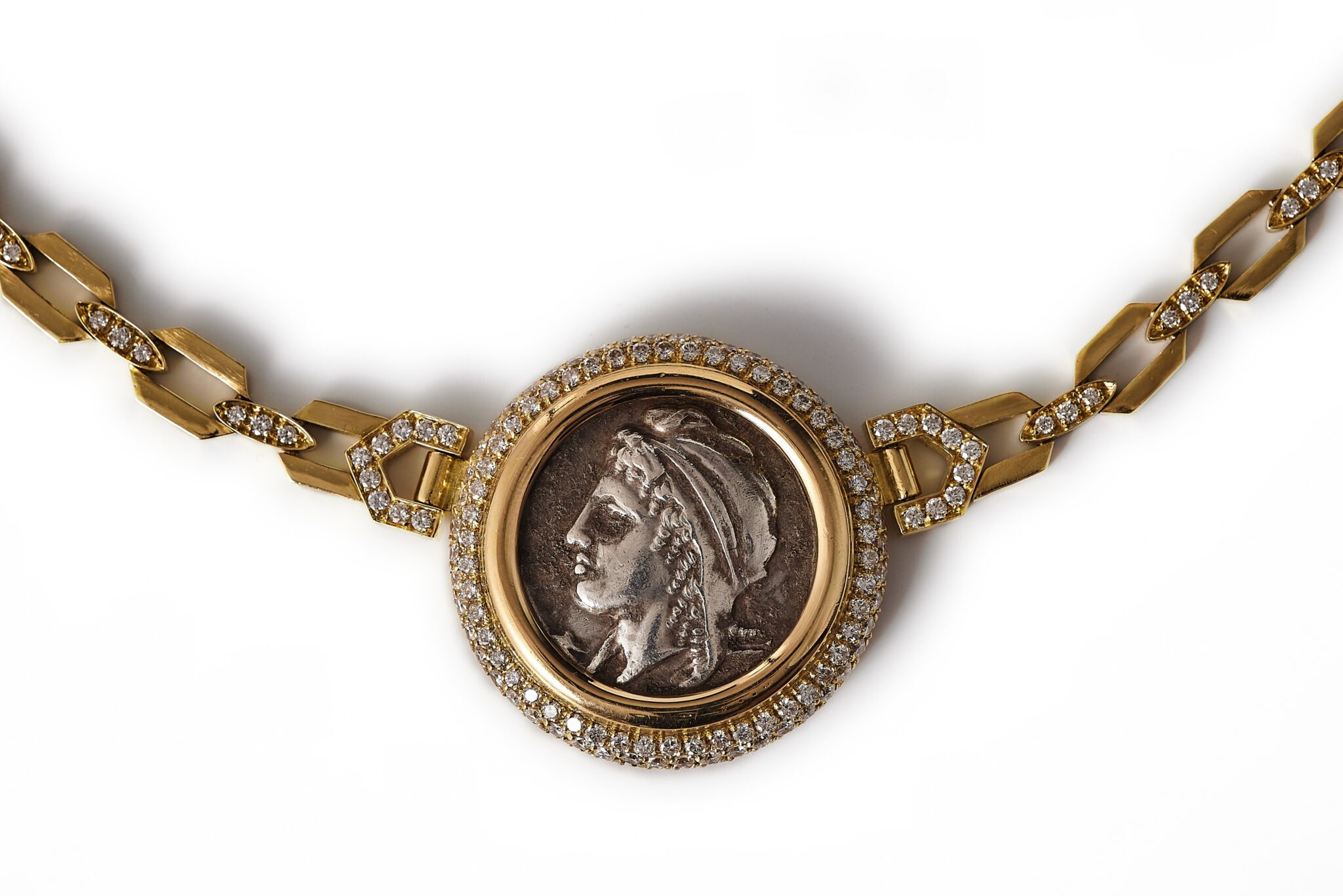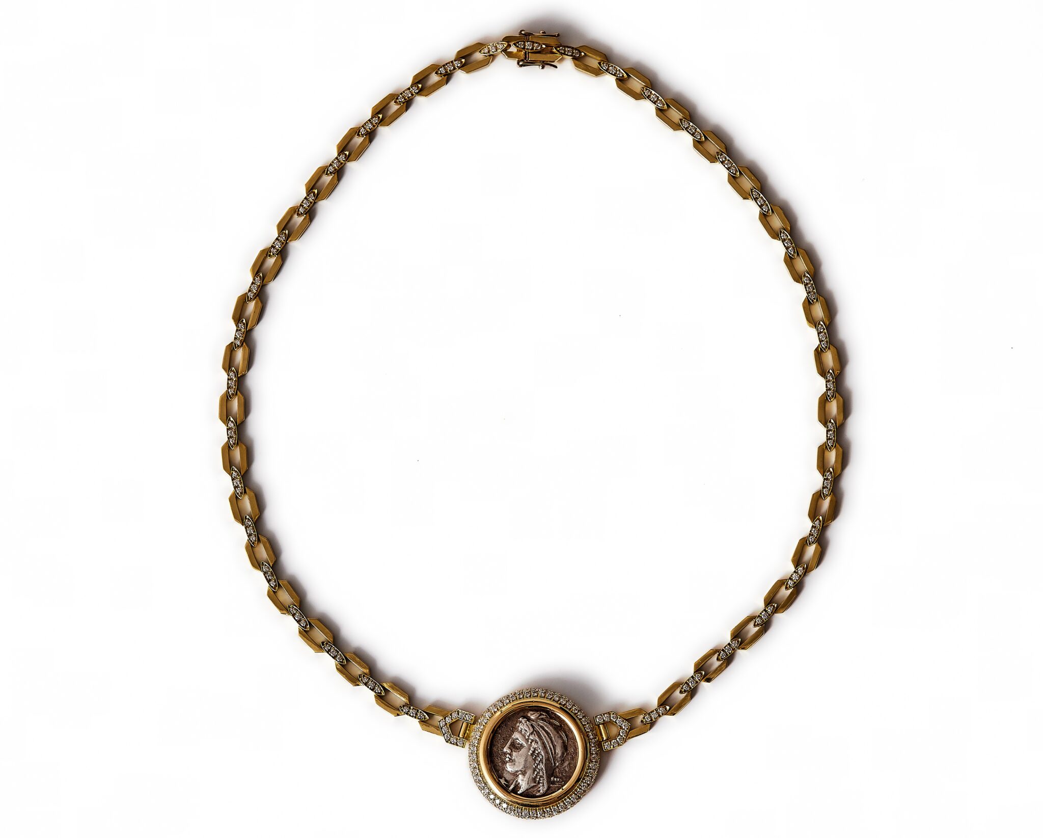 Important 1970s Bulgari Monete, Tetradrachm, 18k Gold and Diamond Necklace.