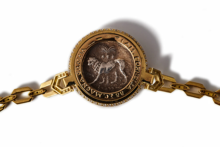 Back is engraved Fam Cornelia – 88 a.c. Magna Graeca. Coin and lock hallmarked 750, Made in Italy, Workshop registry and signed BVLGARI.