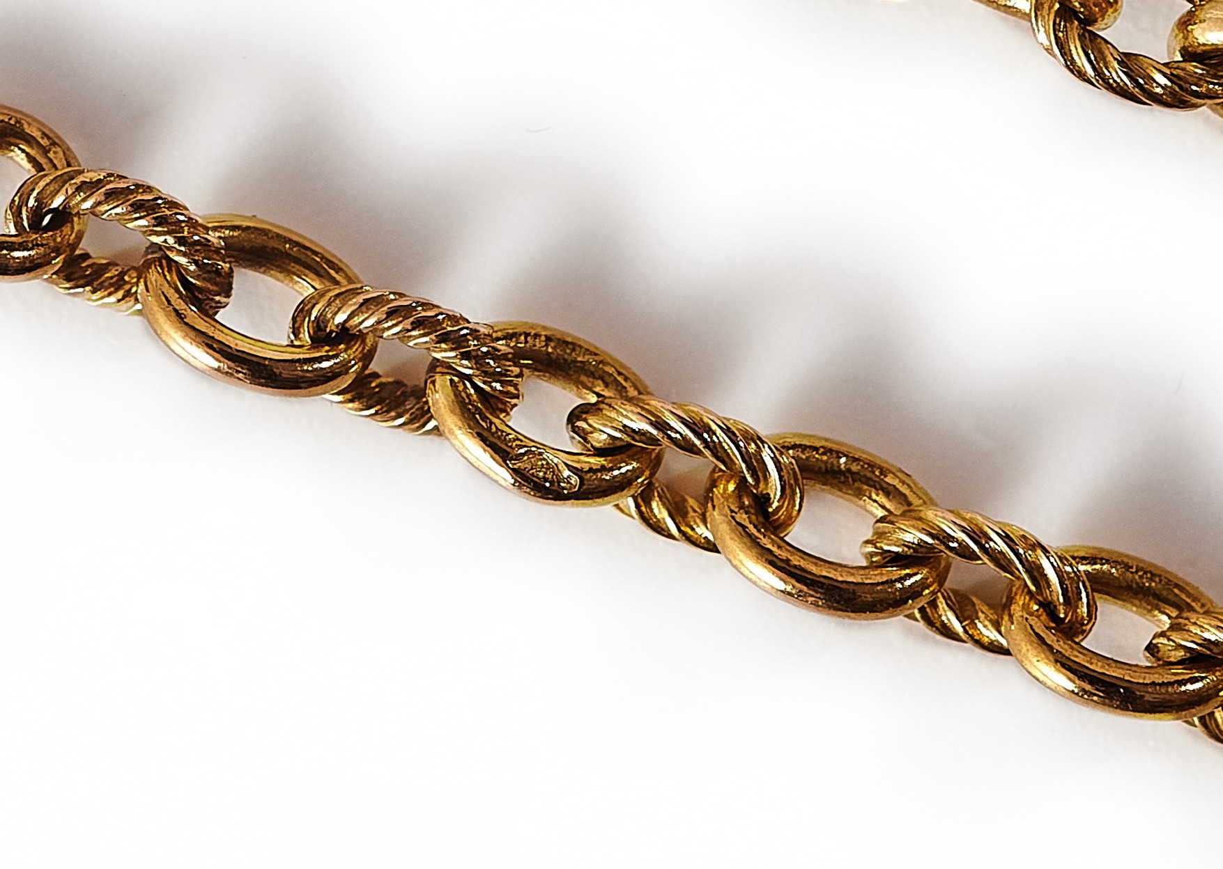 Yellow gold, stamped 750, chained marked with illegible maker.